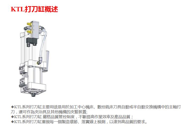 - KTL系列打刀缸主要用途是用于加工中心機床、數(shù)控銑床刀具自動或半自動交換機構(gòu)中的主軸打刀,還可作為夾治具及其他機構(gòu)的夾緊裝置;