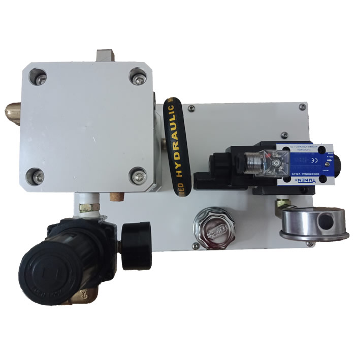1泵體是通過輸入低氣壓氣體作用于大面積活塞側(cè)通過連桿使小面積活塞側(cè)產(chǎn)生高液壓,兩側(cè)的活塞壓力相等時,泵體有壓力輸出,活塞處于靜止?fàn)顟B(tài)(工件處于夾緊或放松狀態(tài)),此時不消耗能量。