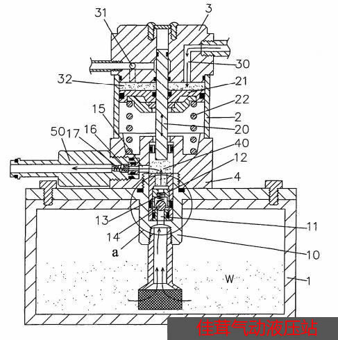 油箱 1,其上組裝設(shè)置有連通結(jié)合一體的閥座10、油壓部本體 4、壓力源缸 2、氣壓部本體 3、并且連接設(shè)置有回路分配控制座 6,氣壓部本體 3 連通于水氣濾除器,水氣濾除器 9 具有氣壓輸入管 90,油壓部本體 4 經(jīng)由一接頭50 而連通于一入油轉(zhuǎn)接座 5、再連通至回路分配控制座 6 ;其中,[0028] 該閥座 10,具有入油孔 11 配合一延伸管而連通于油箱 1,其內(nèi)設(shè)有由彈簧 13、鋼珠 14 所組成的單向閥 12,從而能夠使油箱 1 的油 W 被汲取上升、但不能反向流回油箱1 內(nèi) ;